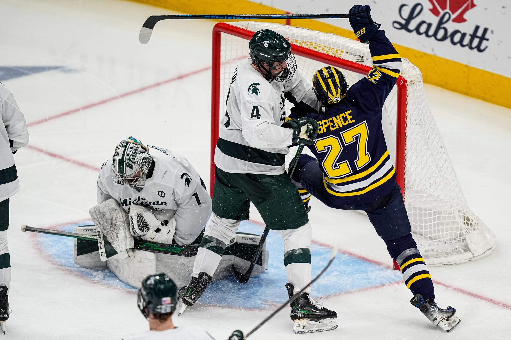 The University of Michigan opened their postseason against Bentley University and came out on top with a decisive 5-1 win. While Spence had just one shot on goal and a blocked shot to show for his effort, he would have more involvement in the game that advanced his team to the Frozen Four, picking up an assist in the Wolverines 4-3 win over Minnesota-Duluth. Spence showed good defensive instincts on the shift leading up to the goal, as he left a backhand drop pass for Jayden Perron which ended up in the back of the net, extending Michigan’s lead to 4-1.