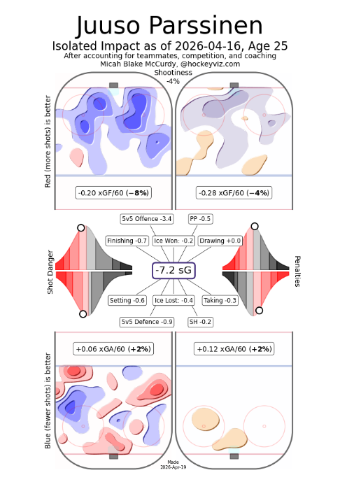 Parssinen ended up appearing in only 15 total AHL games, tallying five goals and two assists. He did get a callup back to the Rangers in March, but went scoreless in six games. His underlying performance at the NHL level was also lackluster. On an already-paltry offensive team, Parssinen’s impact was still negative relative to other players.