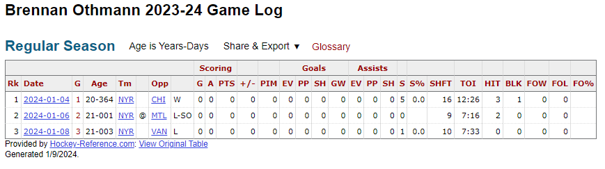 Othmann had a brief 3-game cup of coffee with the Rangers, and he didn’t play as much in the final two games because Peter Laviolette double shifted top-six players to try and get the team back in the game.