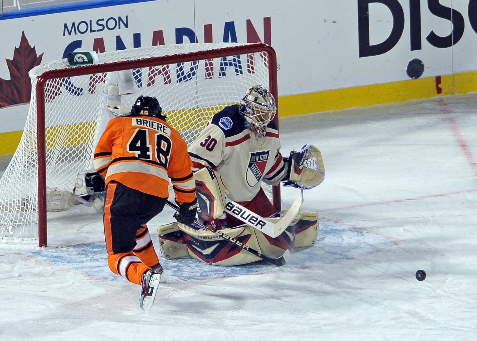 Closing out the win wouldn't be uneventful for the Rangers, as with 20 seconds left the officials called a penalty shot for the Flyers. Following a net front scramble as the Flyers tried to tie the game up with their net empty, Ryan McDonagh sprawled through the crease to help out netminder Henrik Lundqvist, but ended up covering the puck completely with his hand. That warrants a penalty shot and taking it was none other than one of Philly's top players, Daniel Briere.