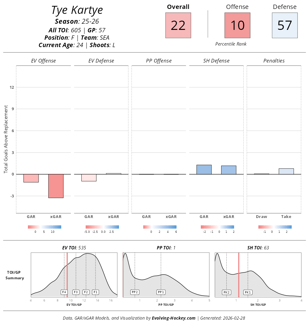 Tye Kartye is the most recent addition to the Rangers, having been claimed off waivers from the Seattle Kraken. In three years in Seattle, Kartye has 20 goals, 21 assists, and 41 points in 180 career games. While he may not be the biggest contributor offensively, Kartye has a very strong defensive game and will likely get time on the penalty kill unit.