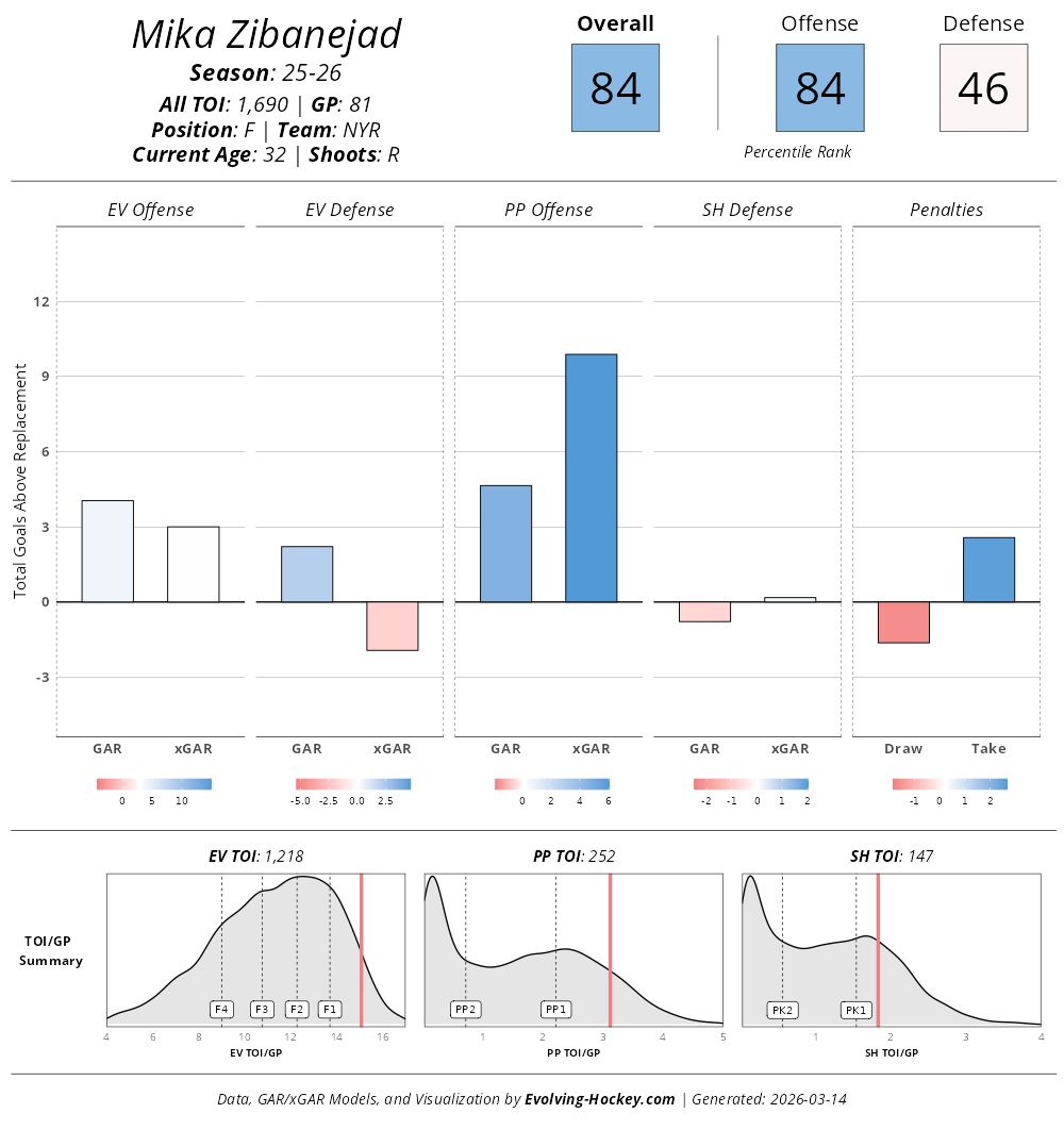 The improved play of Mika Zibanejad has been one of the few bright spots this season. So far, Zibanejad has 62 points in 64 games played this season, which puts him on pace to have his best season since the 2022-23 season. He has also played a crucial role in helping get the most out of Alexis Lafrenière and Gabe Perreault.