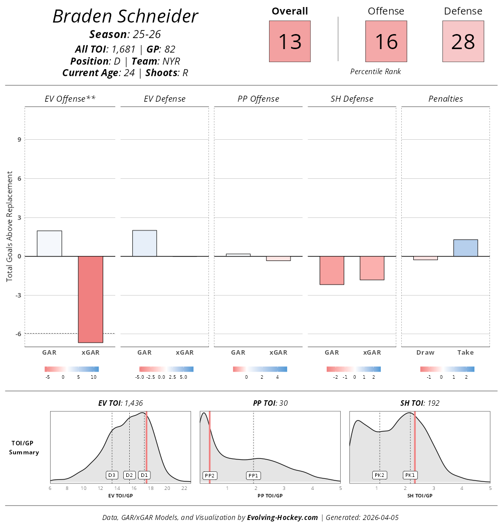Including this game, the Blueshirts only have five games remaining, and Braden Schneider's future remains uncertain. The pending restricted free agent has struggled to find his spot in the lineup. Whether it be trying to play him on his offside and move him to the second pair or keep it on his preferred side, his performance remains lackluster.