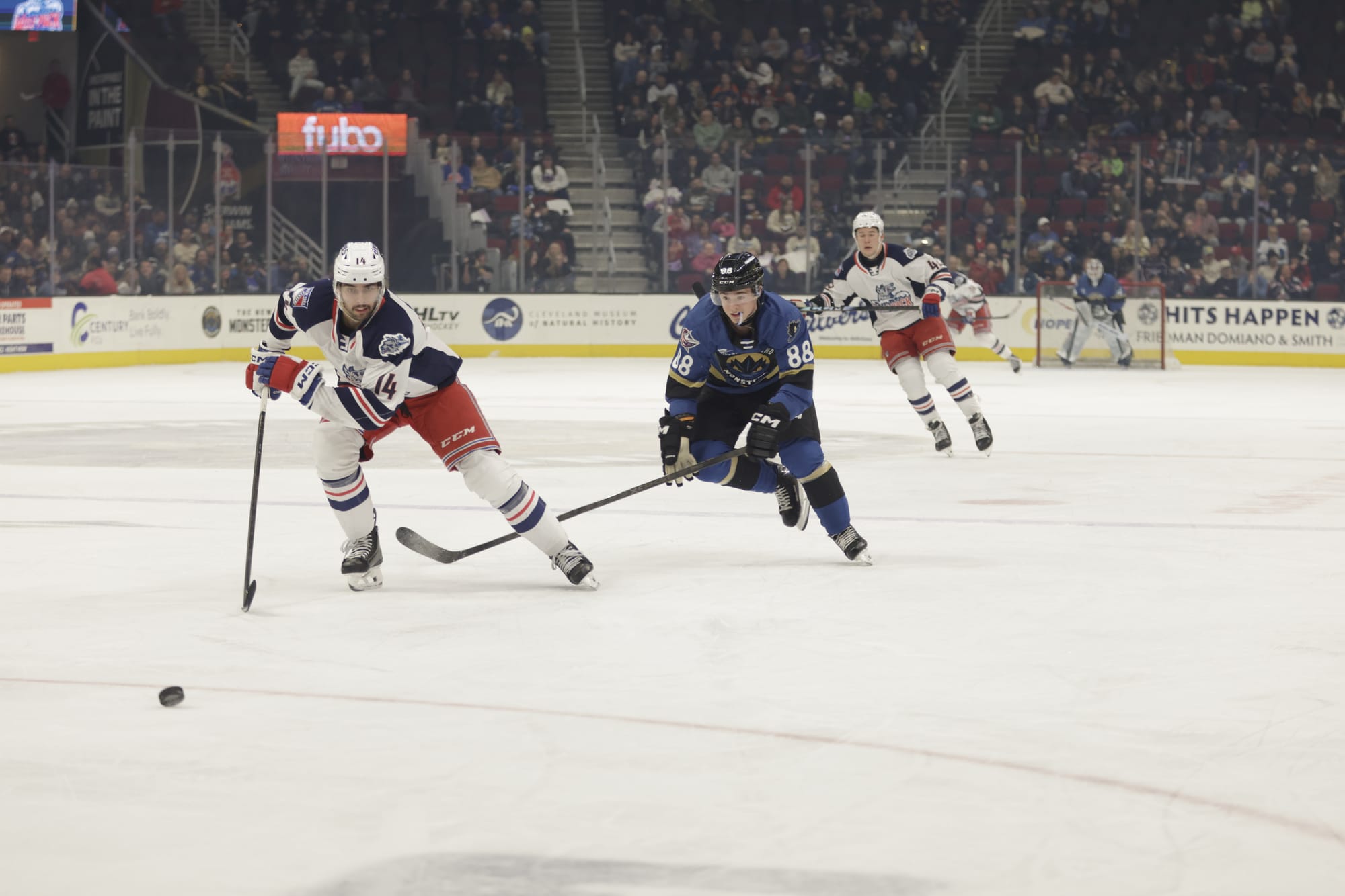 The Wolf Pack finally got on the board about 12 minutes into the final frame. Slashing calls against Connor Mackey and Jack Williams initiated a four-on-four sequence. On the ensuing play, Casey Fitzgerald carried the puck into the Cleveland zone before being bumped off of it down low. The puck trickled to Justin Dowling behind the net, who snapped a quick pass to Gabe Perreault cutting to the slot. Perreault flicked a quick shot that beat Sawchenko to end the shutout bid and cut the lead in half.