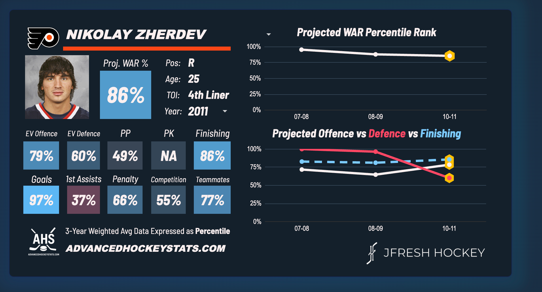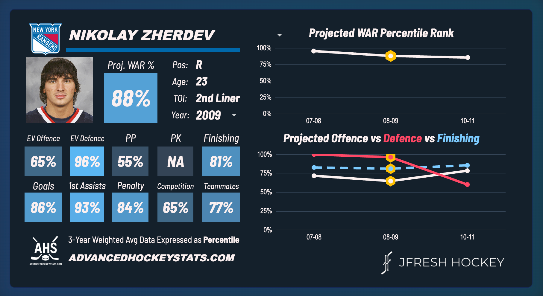 Unlike Christian Backman and most other members of the 2007 through 2009 Rangers, Nik Zherdev was very good. He was a 25-year-old offensive winger who the Rangers walked away from in arbitration for some reason. He was still a very good offensive winger when he returned to the NHL for the 2010-11 season after a year in Russia, but ended up in Peter Laviolette’s doghouse and played only 56 games before his NHL career was over for good.