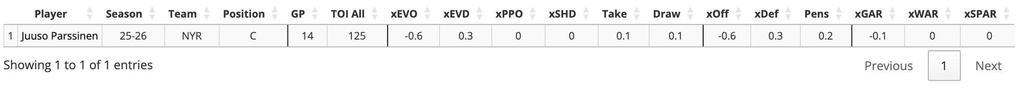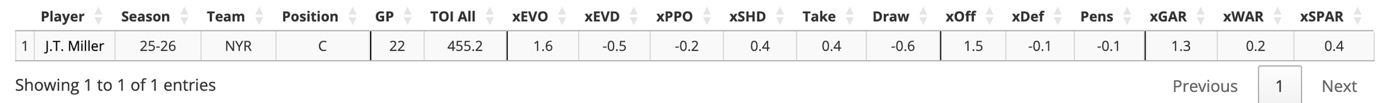 Evolving Hockey has Parssinen with -0.1 xGAR and 0.0 xWAR, while Miller has 1.3 xGAR and 0.2 xWAR.