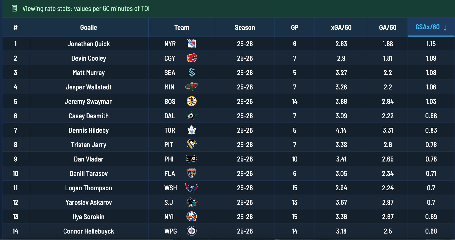 The idea of Quick being the third goalie on Team USA is an interesting one. In limited playing time, he has the highest Goals Saved Above Expected per 60 Minutes of any goalie who has played at least five games, ahead of candidates such as Jeremy Swayman, Spencer Knight, Joey Daccord, and Thatcher Demko.