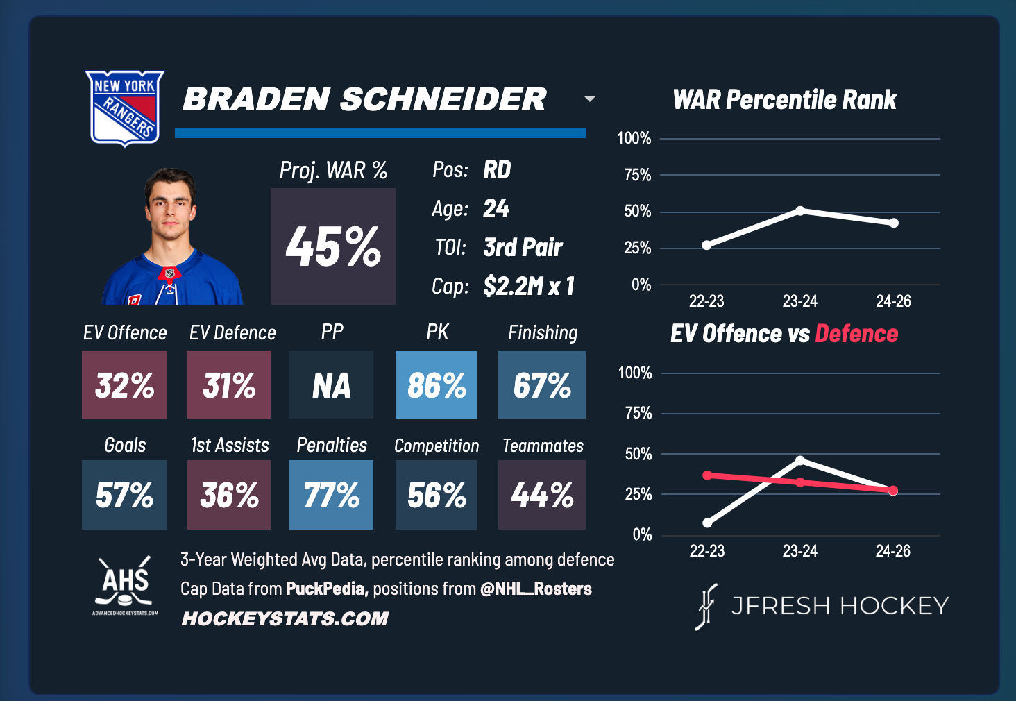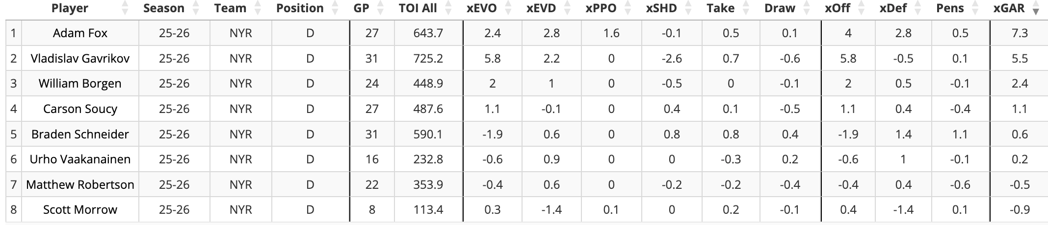 In the Braden Schneider conversation, Chip said that he is “not better than Fox or Borgen, and more expensive than Morrow.” Looking at the advanced metrics for this season, Evolving Hockey has Schneider as the Rangers fifth best defenseman behind Fox (obviously) and Borgen, with Morrow rating as the Rangers worst defenseman through his eight games this season: