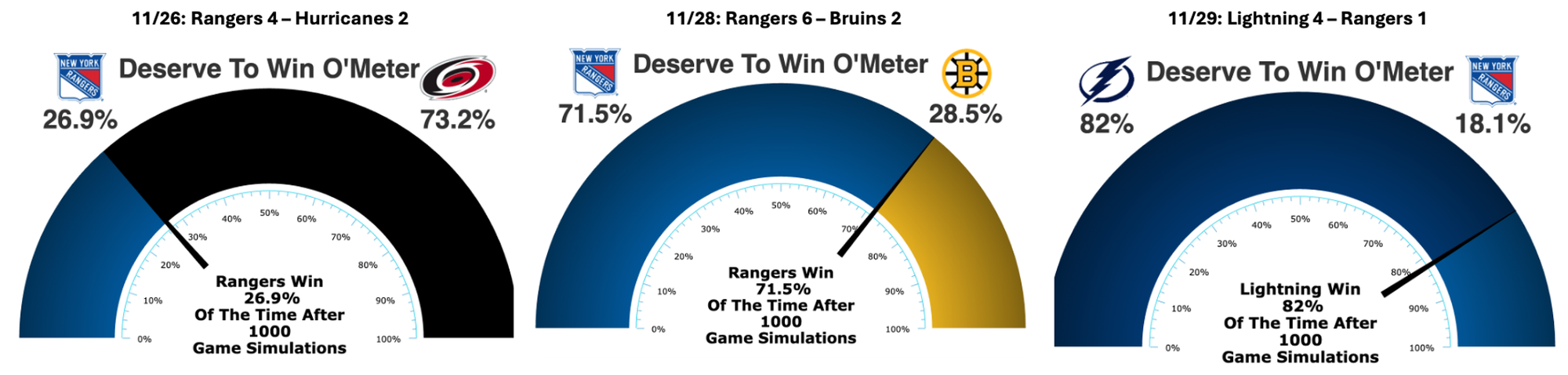 Looking back at the games played the week prior to the podcast being recorded, Eric said that the Rangers were “outplayed by Carolina and thoroughly destroyed by Tampa Bay.” MoneyPuck generally backs up Eric’s assertion, although the Rangers outplayed Boston on Black Friday!