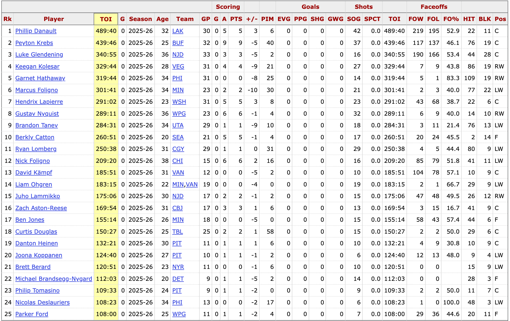 Phillip Danault, who is somehow getting trade buzz, still leads the league in minutes played by a forward who is yet to score a goal, with Peyton Krebs in a close second. While Conor Sheary found the net and mercifully removed himself from this list, Brett Berard has crept up to 21st: