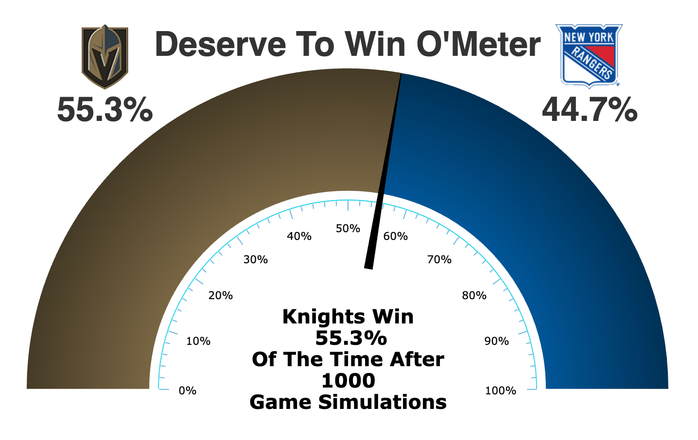 Although Joe and Eric are not ones to complain about the officiating costing the Rangers a game, I’ll provide this link to a video of the play in question at the beginning of overtime when Mitch Marner tripped Matthew Robertson and was not called for a penalty. Per MoneyPuck it was a pretty even game that the Rangers would be expected to win 44% of the time: