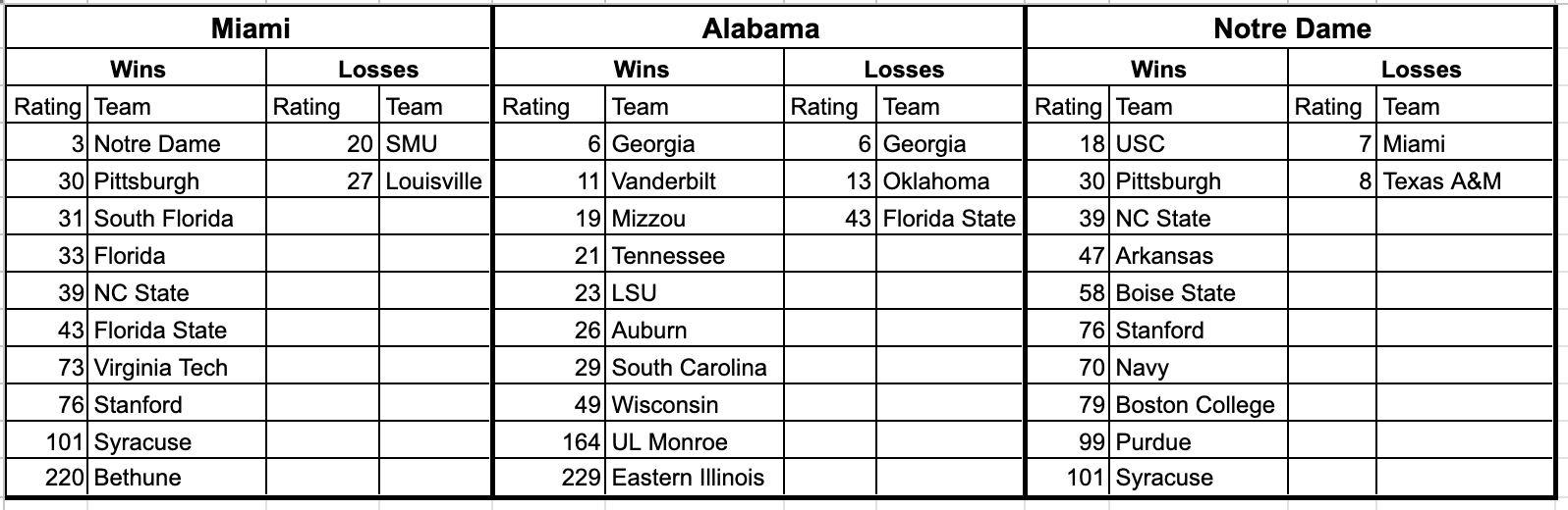Let’s compare the resumes of the teams that were in consideration for the final at large bids, Alabama, Notre Dame, and Miami: