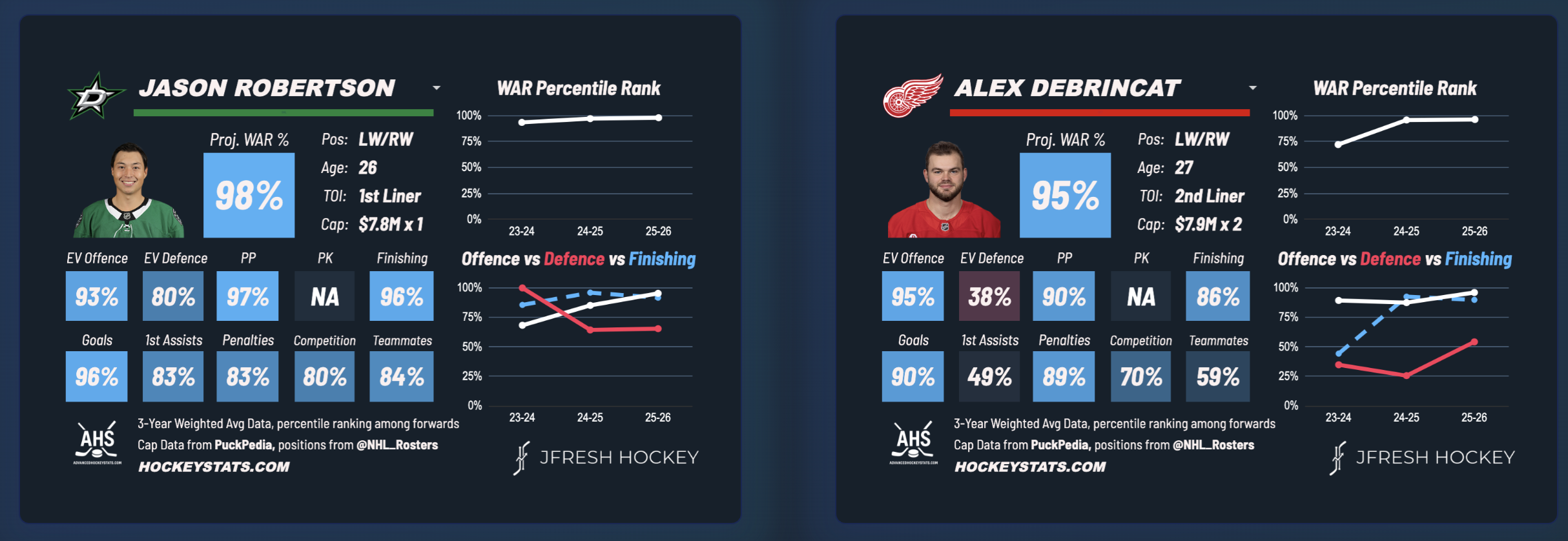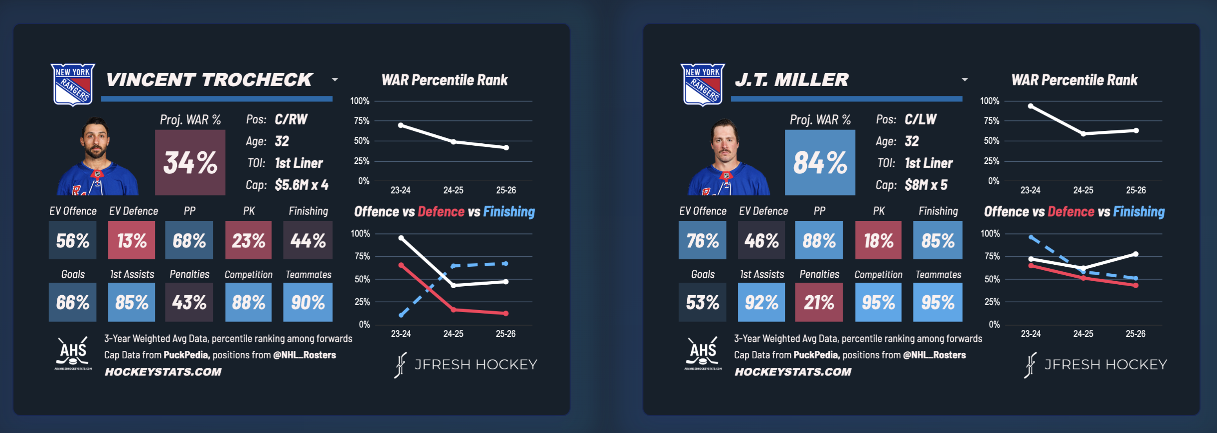 BigBlue66 brought up plus/minus to compare J.T. Miller and Vincent Trocheck, who have been selected for Team USA, to Jason Robertson and Alex DeBrincat, who have not been selected. Using JFresh’s advanced metrics, we can see that Robertson and DeBrincat are much better players and it’s inexcusable to select Trocheck and an injured Miller over them: