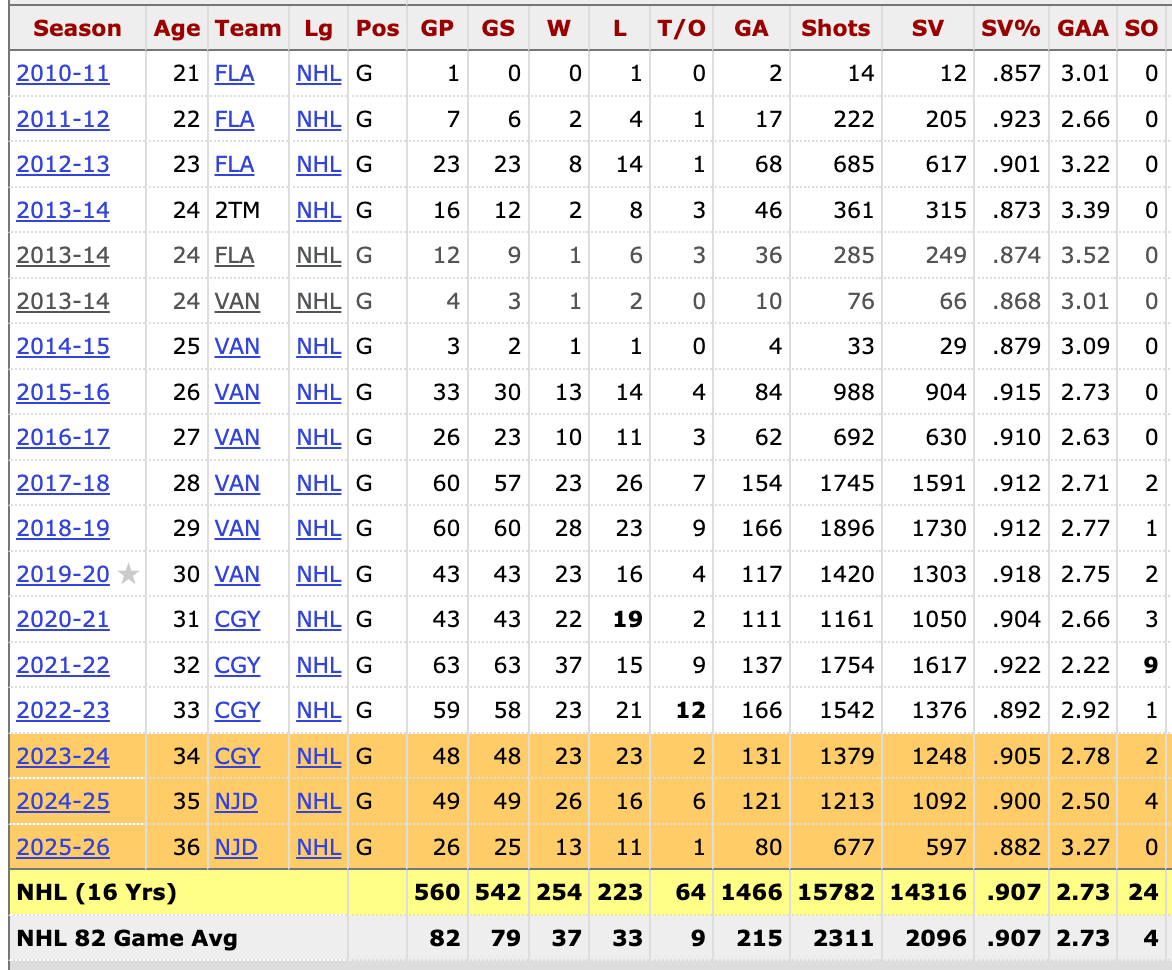 All that being said, Jacob Markstrom is a 36 year old with a career .907 save percentage. It isn’t shocking for a middling goalie who’s that old to regress the way that Markstrom has this season: