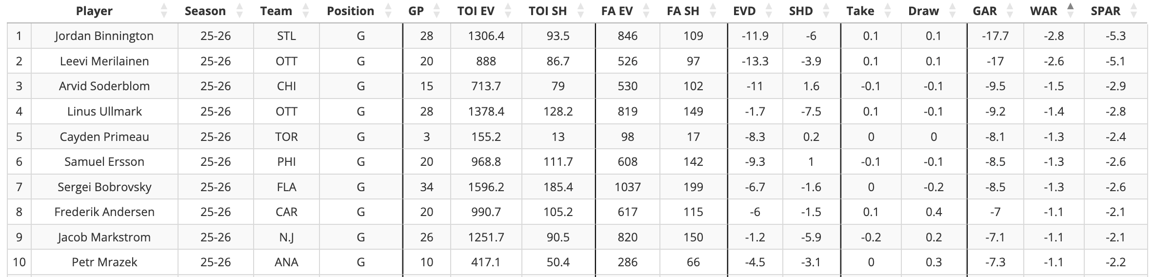 Martin Brodeur was tapped to fix the New Jersey Devils goaltending before this season, and Jacob Markstrom has since imploded. Per EvolvingHockey’s WAR metric, he was the eighth best goalie in 2023-24 and the 32nd best goalie in 2024-25. While not otherworldly, he was solidly above replacement level and a competent NHL starter at the very least. This year he has plummeted to being the eighth worst goalie in hockey, being more than a full win below replacement level.