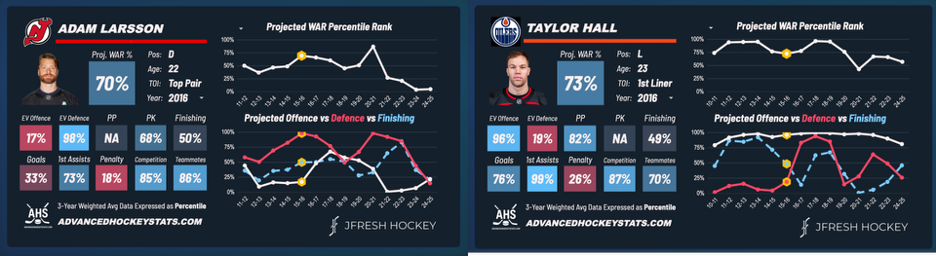 The other trade that was mentioned as being particularly egregious was the shocking Taylor Hall for Adam Larsson trade that was consummated just days before free agency was set to start in 2016. At the time, it was seen as two similarly productive players who played different positions being swapped because of their teams’ needs, and the contemporary player cards bear this out: