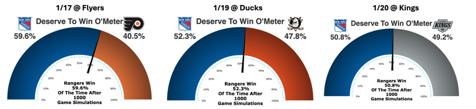 Joe said that “the Rangers play has improved post-letter.” Between the release of the letter on Jan. 16 and the recording of the podcast, the Rangers went 1-2, beating the Philadelphia Flyers 6-3 and then losing the first two games on what would eventually be an 0-3 trip through California. All that being said, MoneyPuck actually said that the Rangers deserved to win both of the games that they lost in SoCal: