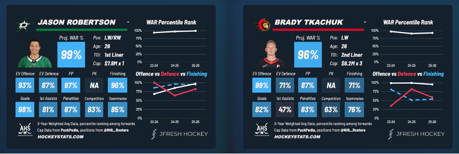 When discussing potential trade acquisitions, Joe said that he thinks that Jason Robertson is a better player than Brady Tkachuk, both of whom are 26 year old American-born left wingers. JFresh’s model agrees with Joe’s assertion, although both are clearly elite players: