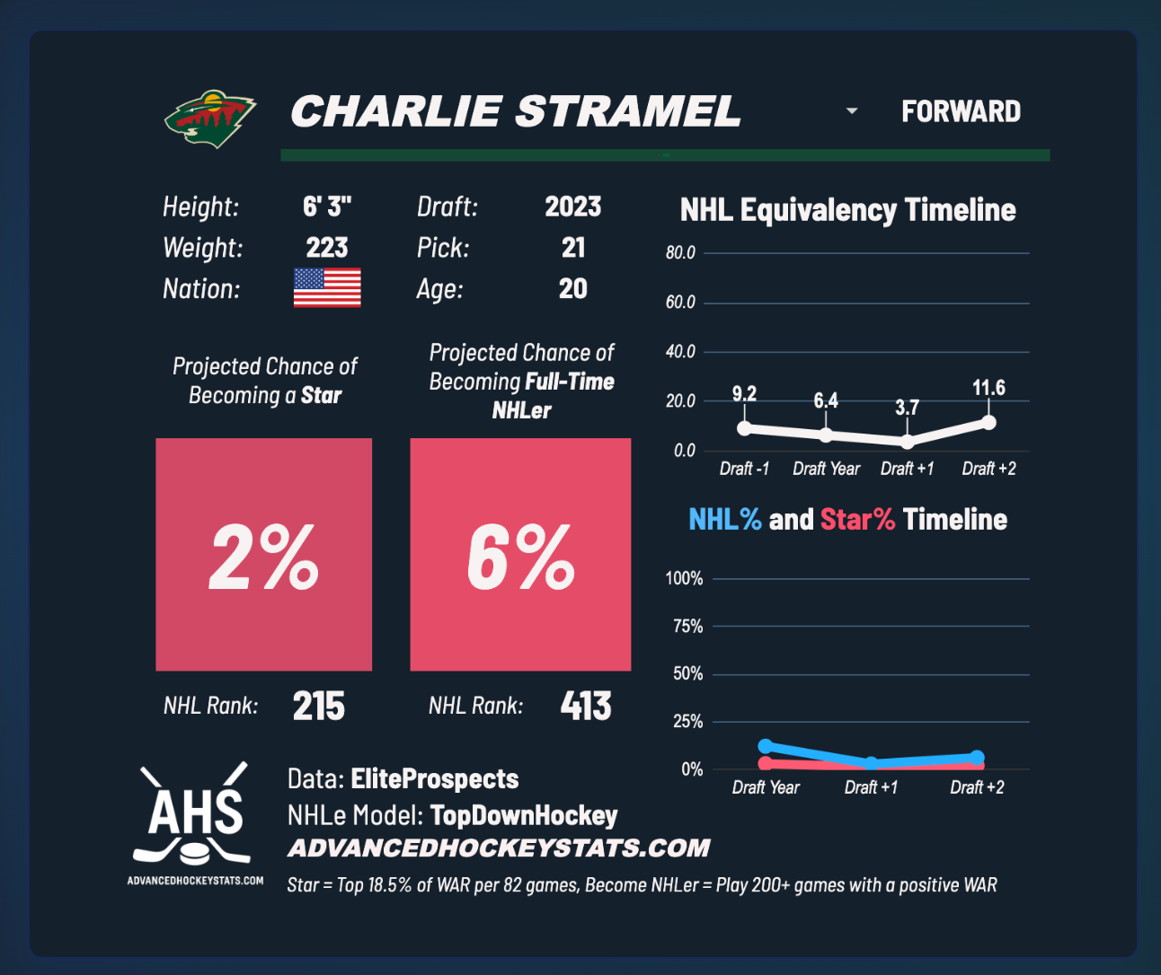 When discussing a potential return in a Vincent Trocheck, Charlie Stramel’s name was mentioned as a piece that might be included in a trade with the Minnesota Wild. Stramel isn’t exactly a top-tier prospect, with JFresh giving him only a 6 percent chance of becoming a full-time NHLer: