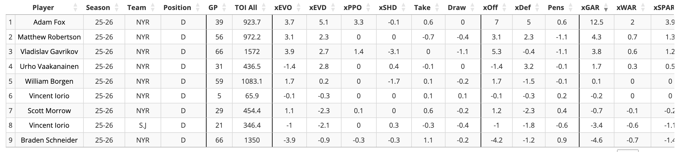 Urho Vaakanainen has become somewhat of a punching bag on this podcast and across the Rangers fan base this season, but he has actually performed as a solid defenseman, outperforming Will Borgen, Vincent Iorio, Scott Morrow, and Braden Schneider on an xGAR basis: