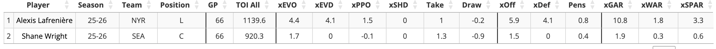 Moving Lafrenière for Shane Wright has been discussed quite a bit this season, as a sort of change of scenery swap of underwhelming high draft picks. Although Lafrenière is two years older than Wright, he’s had a significantly better season per EvolvingHockey and projects out better per JFresh: