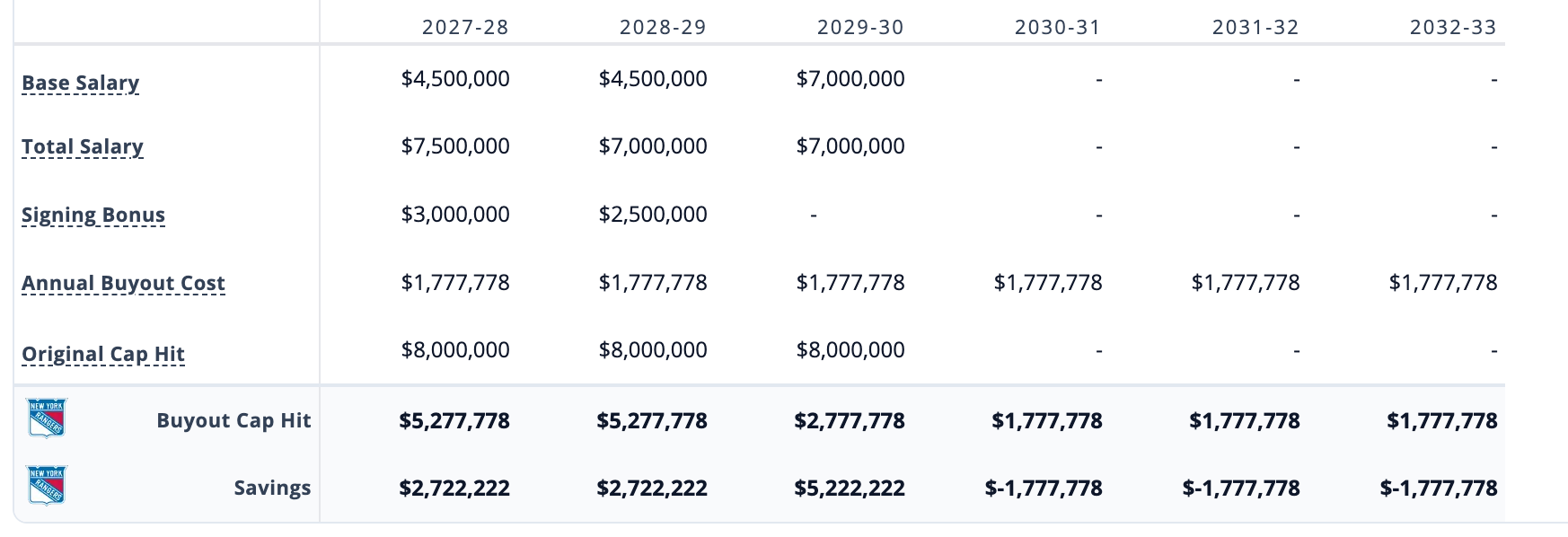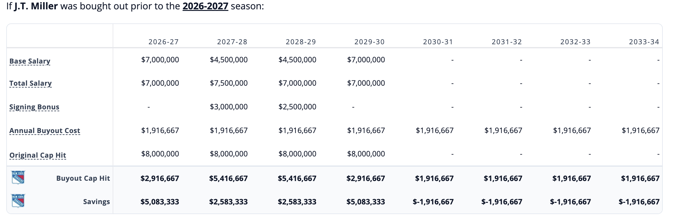 It was asked, "What would getting out of the J.T. Miller contract look like?" Miller has four more seasons after this one left on his contract. His full no-movement clause extends for one more season, before becoming a 15-team no-trade list during the 2027 offseason. If you wanted to buy him out this offseason, you’d see significant savings for the next four seasons before four seasons of a $1.9m dead cap hit, during which time the cap would likely continue to increase.