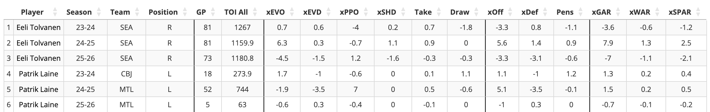 Chip mentioned Eeli Toilvanen and Patrik Laine as intriguing free agent options who could be found in the bargain bin this offseason. Per Evolving-Hockey, Tolvanen has mostly been a below-replacement level player outside of his breakout 2024-25 season, and Laine is basically a replacement level player. Maybe Laine can recapture the magic of his first two season where he scored a combined 80 goals.