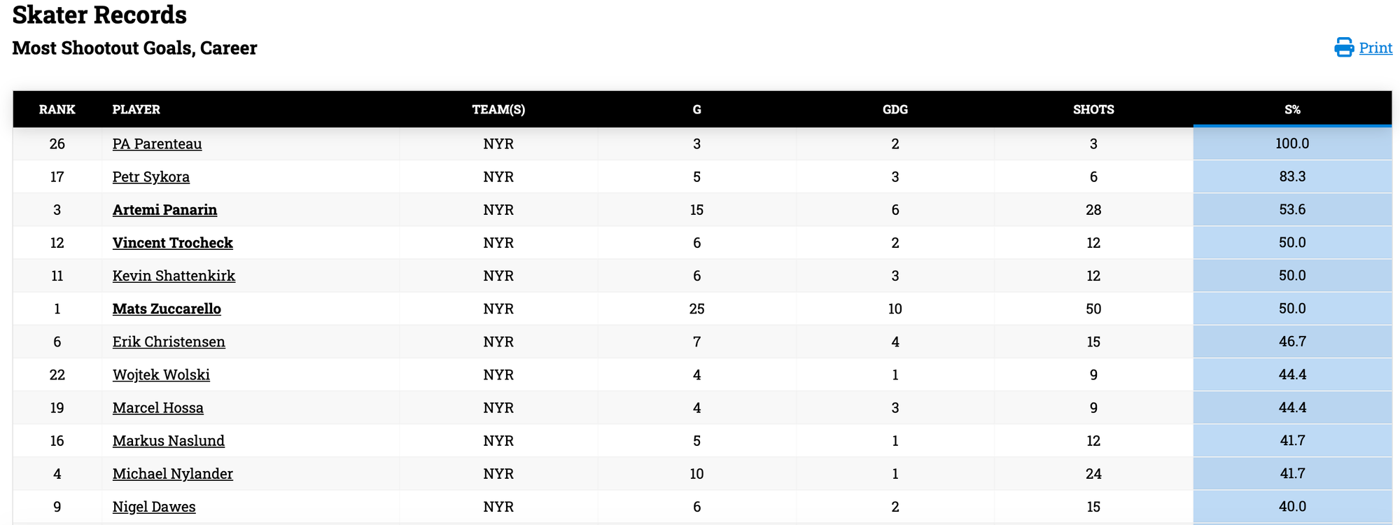 Of note, the best Ranger of all time with at least 10 attempts in the shootout is Artemi Panarin, who converted on 53 percent of the 28 attempts that he took with the Rangers: