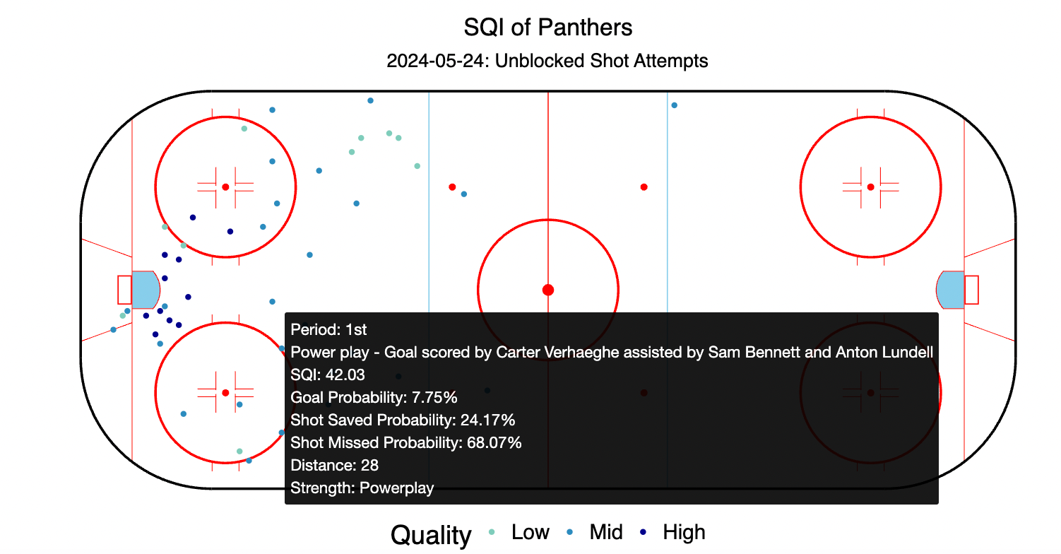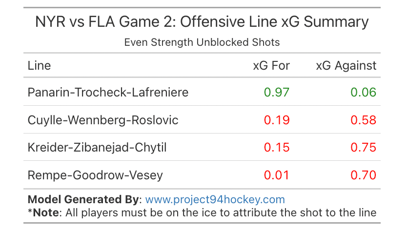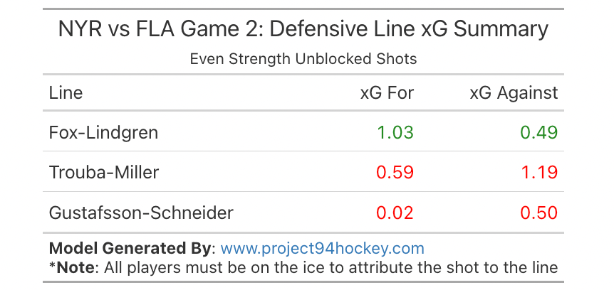 It's hard to not want to cut through the numbers for Matt Rempe, as it's been said that he brings an element that can't be caught by analytics, which I am by no means disputing. The Rempe-Goodrow-Vesey line, however, had an xG against of 0.7, which is quite high for the 4th line and the 3rd line had 0.75 xG against. Goodrow's Average SQI against at even strength was 48.18 and was on the ice for 3 high quality shots from the Panthers (same for Rempe).