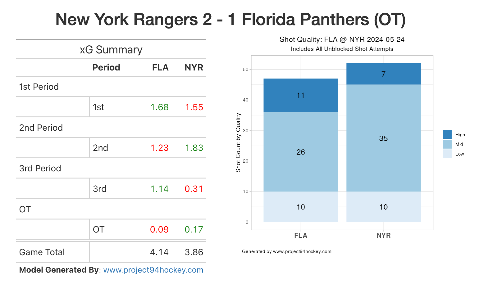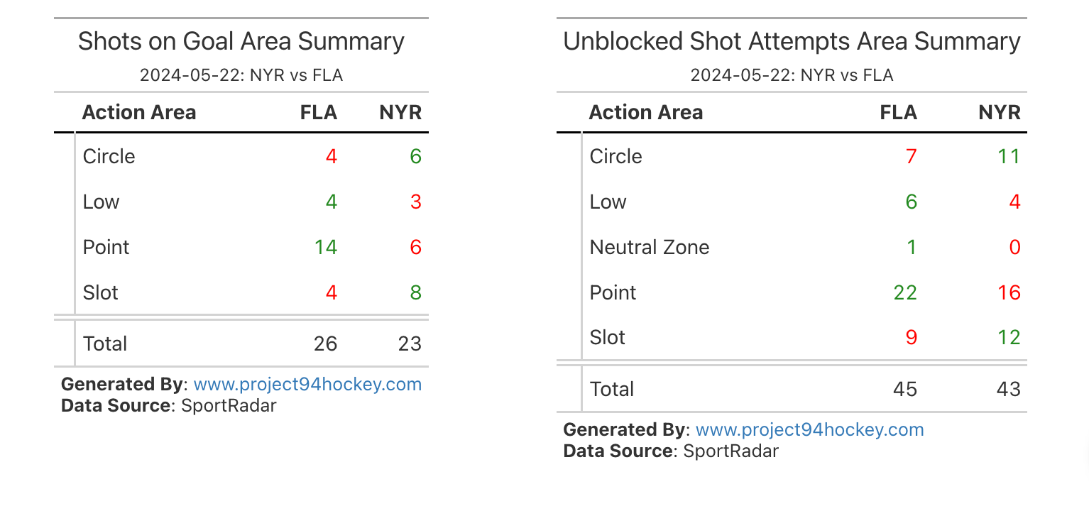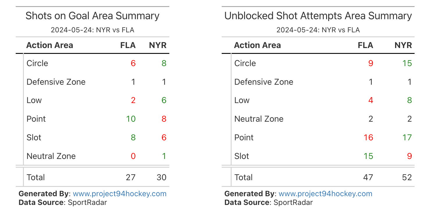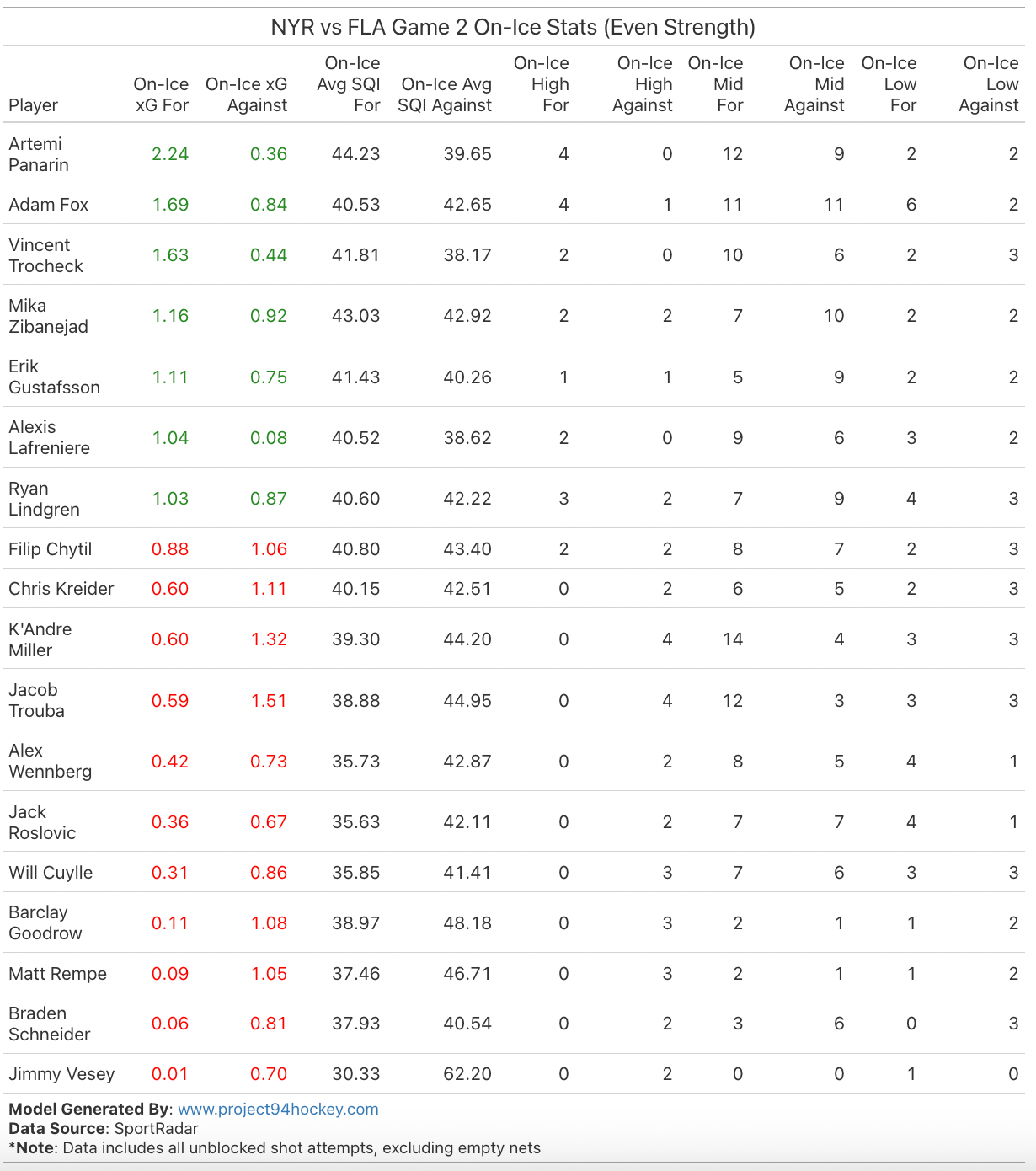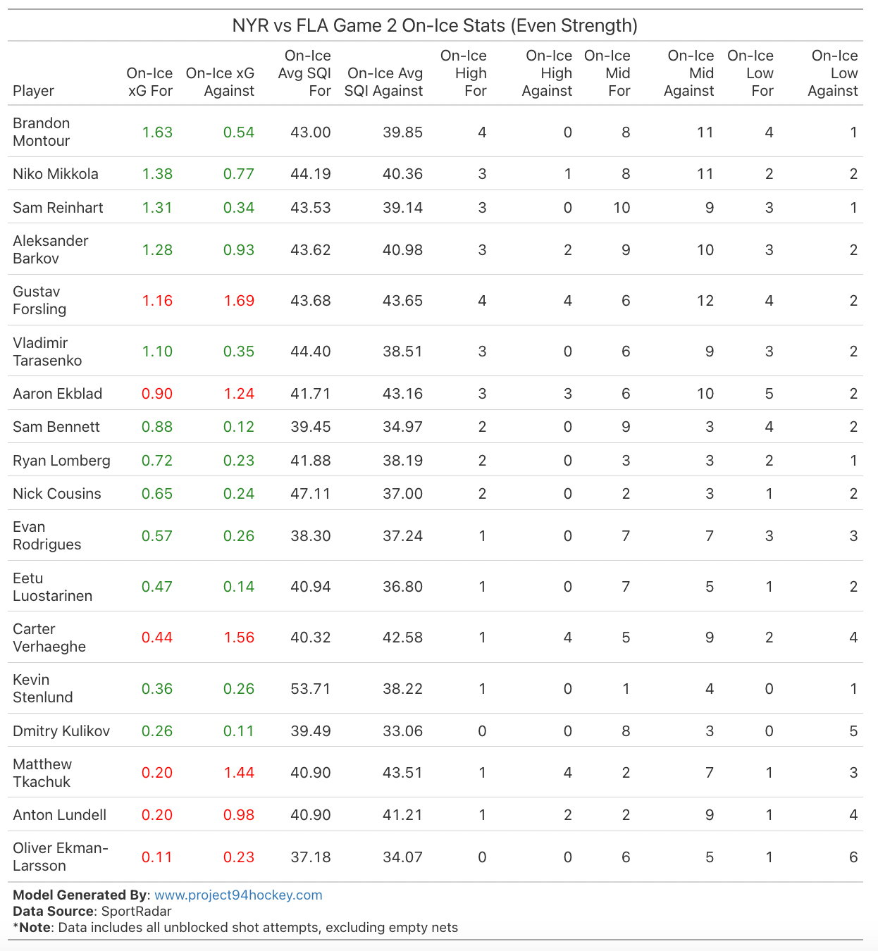 The Rangers played an entirely different game from Game 1 last night. They had the same number of high quality shots, but increased their 'mid' quality shots by 13. I understand their xG dropped by nearly 2 goals, but there were a few doorstep chances that the Rangers had in Game 1 that drove that number very high. It was also clear that the Panthers were doing a very good job of blocking shot lanes from the point as they blocked 23 of the 78 shot attempts from the Rangers. Adam Fox, who played extremely well with an on-ice xG of 1.69, had 5 of his 9 shot attempts blocked (xG does not include blocked shots). Despite lower quality chances from the point being blocked, the Rangers still generated enough high quality shots to match Florida's play.