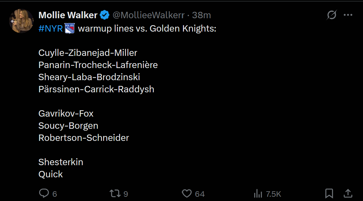 Tonight, the New York Rangers are on the road, facing off against the Vegas Golden Knights. After a poor showing against the Detroit Red Wings, the Rangers are eager to bounce back. There are a few lineup changes tonight: Mike Sullivan has returned and will be behind the bench for the Blueshirts, something they sorely missed; the Rangers have already had more than enough of their share of games under David Quinn's guidance. Second, Juuso Parssinen is slotting into the fourth line in place of Adam Edstrom, and Will Borgen is returning to the lineup after missing the game in Detroit.