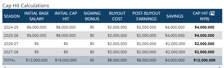 If bought out, the Rangers would save $4 million a season the next two years, and have two years with a dead cap charge of $2 million, but in the aggregate would save $4 million.